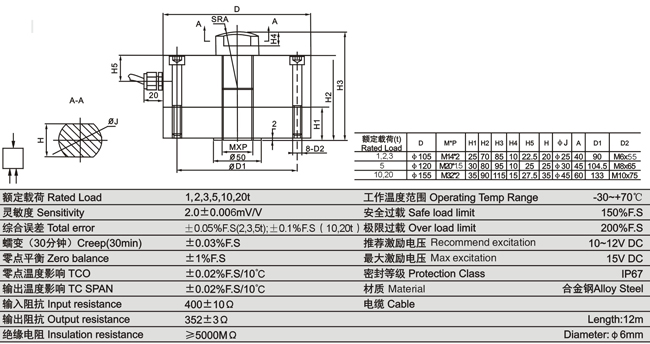 美國(guó)SUNCELLS LFSC-10T稱(chēng)重傳感器參數(shù)尺寸:
