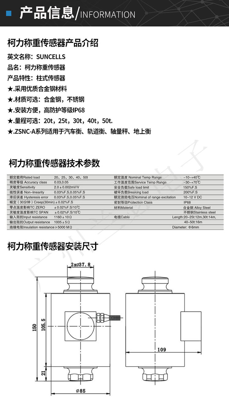 Suncells ZSNC-A傳感器產品型號:注:ZSNC柱式傳感器,可選ZSNC-SS不銹鋼稱重傳感器、ZSNC-D數字稱重傳感器